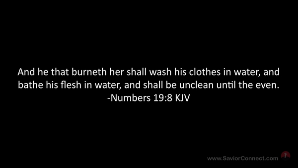 And he that burneth her shall wash his clothes in water, and bathe his flesh in water, and shall be unclean until the even. -Numbers 19:8 KJV