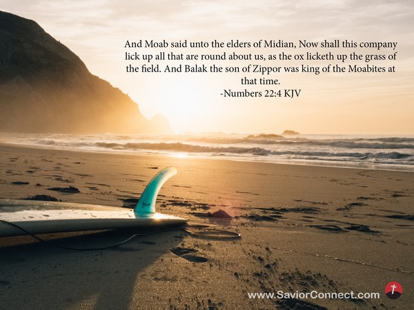 And Moab said unto the elders of Midian, Now shall this company lick up all that are round about us, as the ox licketh up the grass of the field. And Balak the son of Zippor was king of the Moabites at that time. -Numbers 22:4 KJV