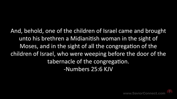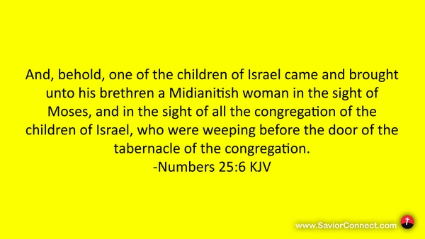 And, behold, one of the children of Israel came and brought unto his brethren a Midianitish woman in the sight of Moses, and in the sight of all the congregation of the children of Israel, who were weeping before the door of the tabernacle of the congregation. -Numbers 25:6 KJV