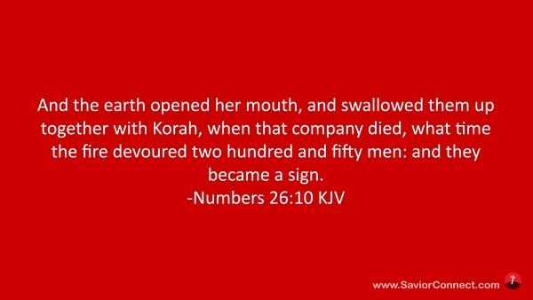 And the earth opened her mouth, and swallowed them up together with Korah, when that company died, what time the fire devoured two hundred and fifty men: and they became a sign. -Numbers 26:10 KJV