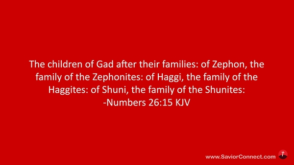 The children of Gad after their families: of Zephon, the family of the Zephonites: of Haggi, the family of the Haggites: of Shuni, the family of the Shunites: -Numbers 26:15 KJV