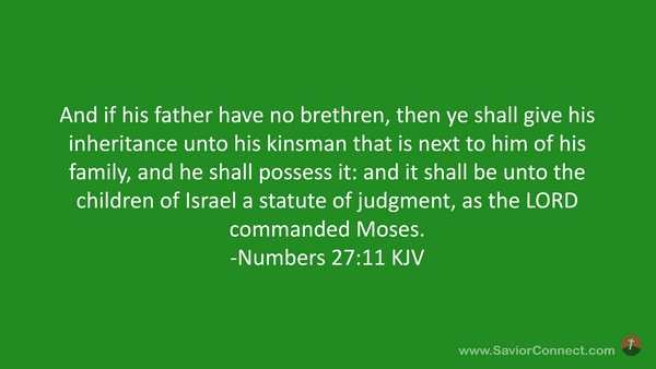 And if his father have no brethren, then ye shall give his inheritance unto his kinsman that is next to him of his family, and he shall possess it: and it shall be unto the children of Israel a statute of judgment, as the LORD commanded Moses. -Numbers 27:11 KJV