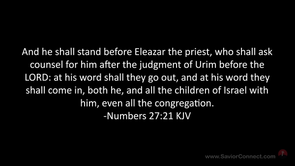 And he shall stand before Eleazar the priest, who shall ask counsel for him after the judgment of Urim before the LORD: at his word shall they go out, and at his word they shall come in, both he, and all the children of Israel with him, even all the congregation. -Numbers 27:21 KJV