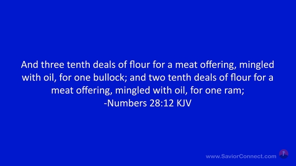 And three tenth deals of flour for a meat offering, mingled with oil, for one bullock; and two tenth deals of flour for a meat offering, mingled with oil, for one ram; -Numbers 28:12 KJV