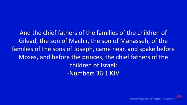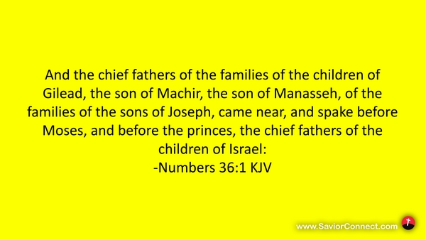 And the chief fathers of the families of the children of Gilead, the son of Machir, the son of Manasseh, of the families of the sons of Joseph, came near, and spake before Moses, and before the princes, the chief fathers of the children of Israel: -Numbers 36:1 KJV