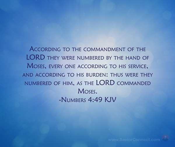 According to the commandment of the LORD they were numbered by the hand of Moses, every one according to his service, and according to his burden: thus were they numbered of him, as the LORD commanded Moses. -Numbers 4:49 KJV