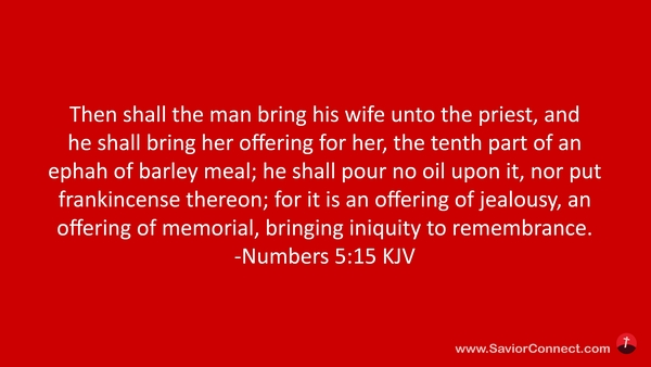 Then shall the man bring his wife unto the priest, and he shall bring her offering for her, the tenth part of an ephah of barley meal; he shall pour no oil upon it, nor put frankincense thereon; for it is an offering of jealousy, an offering of memorial, bringing iniquity to remembrance. -Numbers 5:15 KJV