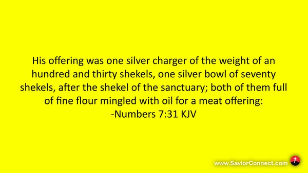 His offering was one silver charger of the weight of an hundred and thirty shekels, one silver bowl of seventy shekels, after the shekel of the sanctuary; both of them full of fine flour mingled with oil for a meat offering: -Numbers 7:31 KJV