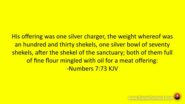 His offering was one silver charger, the weight whereof was an hundred and thirty shekels, one silver bowl of seventy shekels, after the shekel of the sanctuary; both of them full of fine flour mingled with oil for a meat offering: -Numbers 7:73 KJV