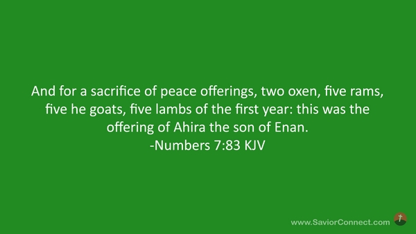 And for a sacrifice of peace offerings, two oxen, five rams, five he goats, five lambs of the first year: this was the offering of Ahira the son of Enan. -Numbers 7:83 KJV