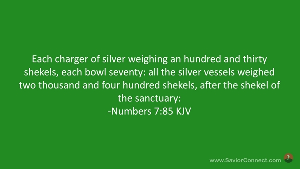 Each charger of silver weighing an hundred and thirty shekels, each bowl seventy: all the silver vessels weighed two thousand and four hundred shekels, after the shekel of the sanctuary: -Numbers 7:85 KJV