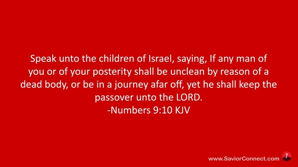 Speak unto the children of Israel, saying, If any man of you or of your posterity shall be unclean by reason of a dead body, or be in a journey afar off, yet he shall keep the passover unto the LORD. -Numbers 9:10 KJV