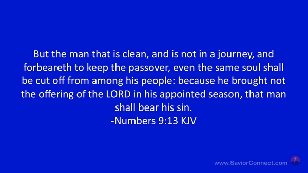 But the man that is clean, and is not in a journey, and forbeareth to keep the passover, even the same soul shall be cut off from among his people: because he brought not the offering of the LORD in his appointed season, that man shall bear his sin. -Numbers 9:13 KJV