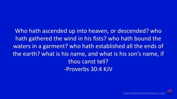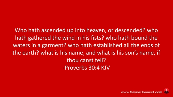 Who hath ascended up into heaven, or descended? who hath gathered the wind in his fists? who hath bound the waters in a garment? who hath established all the ends of the earth? what is his name, and what is his son's name, if thou canst tell? -Proverbs 30:4 KJV