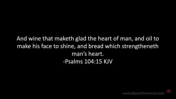 And wine that maketh glad the heart of man, and oil to make his face to shine, and bread which strengtheneth man's heart. -Psalms 104:15 KJV
