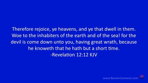 Therefore rejoice, ye heavens, and ye that dwell in them. Woe to the inhabiters of the earth and of the sea! for the devil is come down unto you, having great wrath, because he knoweth that he hath but a short time. -Revelation 12:12 KJV