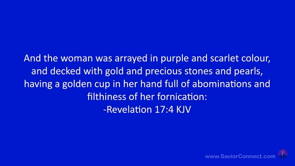 And the woman was arrayed in purple and scarlet colour, and decked with gold and precious stones and pearls, having a golden cup in her hand full of abominations and filthiness of her fornication: -Revelation 17:4 KJV
