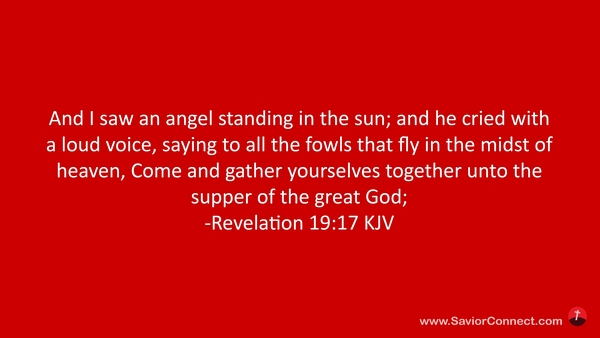 And I saw an angel standing in the sun; and he cried with a loud voice, saying to all the fowls that fly in the midst of heaven, Come and gather yourselves together unto the supper of the great God; -Revelation 19:17 KJV