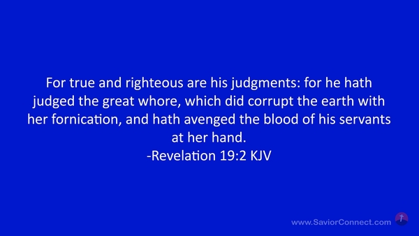 For true and righteous are his judgments: for he hath judged the great whore, which did corrupt the earth with her fornication, and hath avenged the blood of his servants at her hand. -Revelation 19:2 KJV