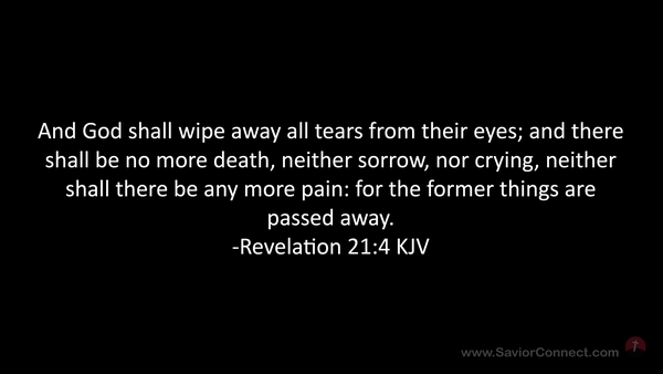 And God shall wipe away all tears from their eyes; and there shall be no more death, neither sorrow, nor crying, neither shall there be any more pain: for the former things are passed away. -Revelation 21:4 KJV