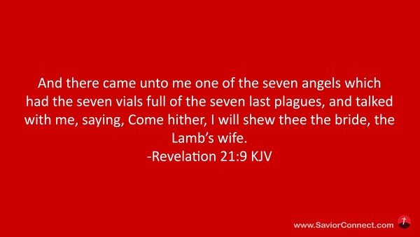 And there came unto me one of the seven angels which had the seven vials full of the seven last plagues, and talked with me, saying, Come hither, I will shew thee the bride, the Lamb's wife. -Revelation 21:9 KJV