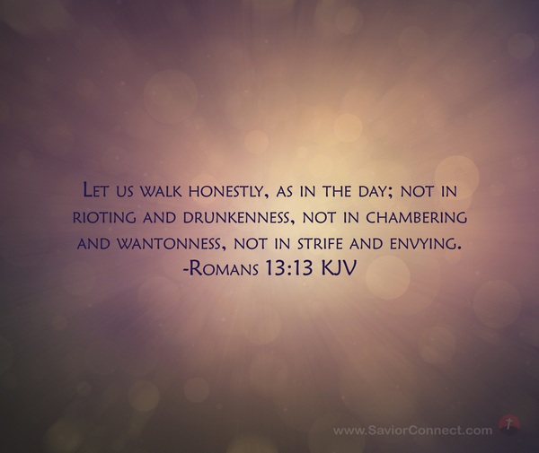 Let us walk honestly, as in the day; not in rioting and drunkenness, not in chambering and wantonness, not in strife and envying. -Romans 13:13 KJV