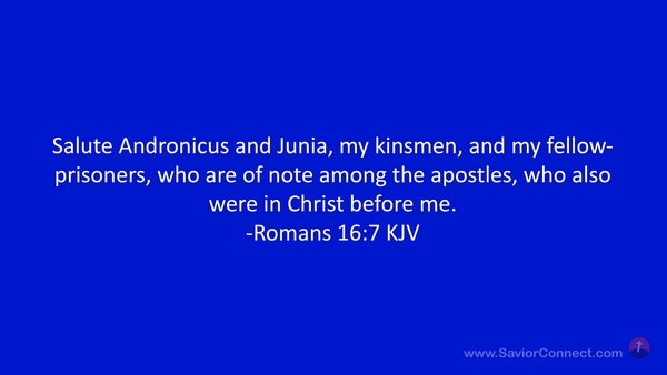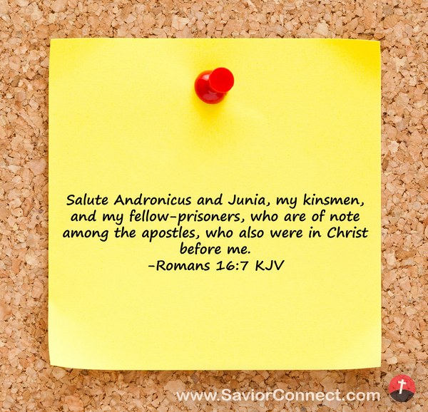 Salute Andronicus and Junia, my kinsmen, and my fellow-prisoners, who are of note among the apostles, who also were in Christ before me. -Romans 16:7 KJV