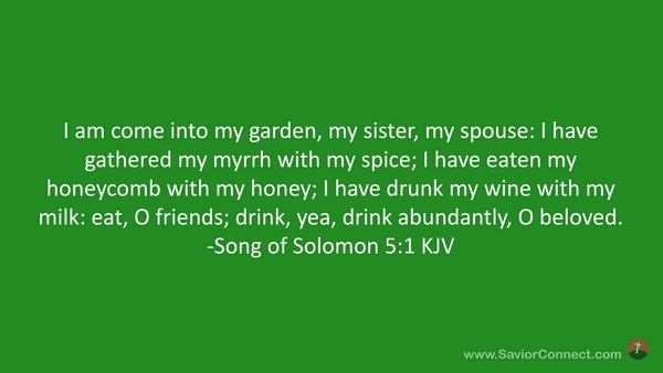 I am come into my garden, my sister, my spouse: I have gathered my myrrh with my spice; I have eaten my honeycomb with my honey; I have drunk my wine with my milk: eat, O friends; drink, yea, drink abundantly, O beloved. -Song of Solomon 5:1 KJV