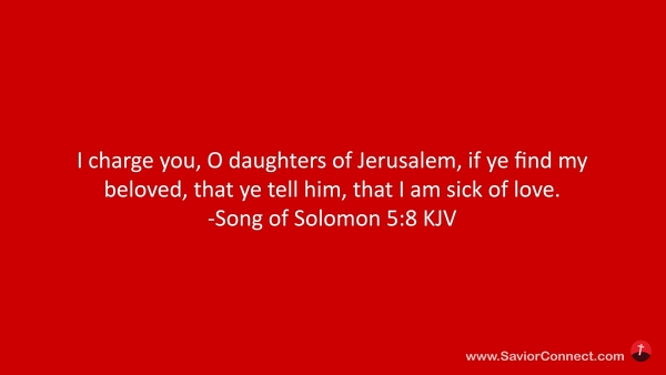 I charge you, O daughters of Jerusalem, if ye find my beloved, that ye tell him, that I am sick of love. -Song of Solomon 5:8 KJV