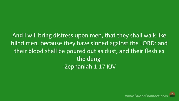 And I will bring distress upon men, that they shall walk like blind men, because they have sinned against the LORD: and their blood shall be poured out as dust, and their flesh as the dung. -Zephaniah 1:17 KJV