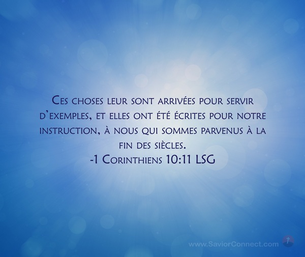 Ces choses leur sont arrivées pour servir d'exemples, et elles ont été écrites pour notre instruction, à nous qui sommes parvenus à la fin des siècles. -1 Corinthiens 10:11 LSG