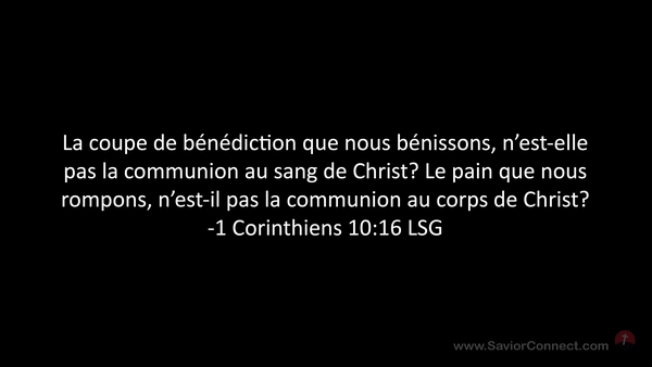 La coupe de bénédiction que nous bénissons, n'est-elle pas la communion au sang de Christ? Le pain que nous rompons, n'est-il pas la communion au corps de Christ? -1 Corinthiens 10:16 LSG