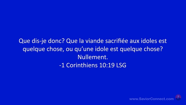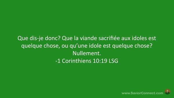 Que dis-je donc? Que la viande sacrifiée aux idoles est quelque chose, ou qu'une idole est quelque chose? Nullement. -1 Corinthiens 10:19 LSG
