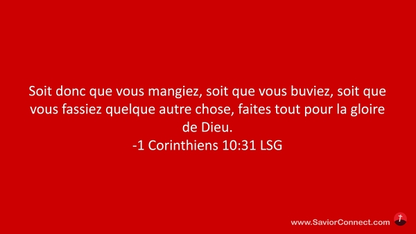 Soit donc que vous mangiez, soit que vous buviez, soit que vous fassiez quelque autre chose, faites tout pour la gloire de Dieu. -1 Corinthiens 10:31 LSG