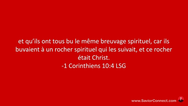 et qu'ils ont tous bu le même breuvage spirituel, car ils buvaient à un rocher spirituel qui les suivait, et ce rocher était Christ. -1 Corinthiens 10:4 LSG