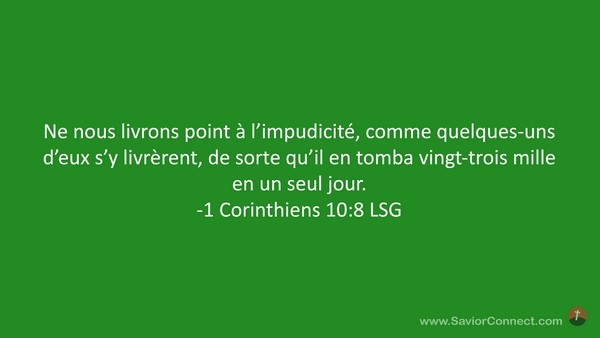 Ne nous livrons point à l'impudicité, comme quelques-uns d'eux s'y livrèrent, de sorte qu'il en tomba vingt-trois mille en un seul jour. -1 Corinthiens 10:8 LSG