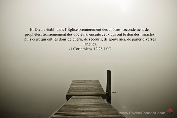 Et Dieu a établi dans l'Église premièrement des apôtres, secondement des prophètes, troisièmement des docteurs, ensuite ceux qui ont le don des miracles, puis ceux qui ont les dons de guérir, de secourir, de gouverner, de parler diverses langues. -1 Corinthiens 12:28 LSG