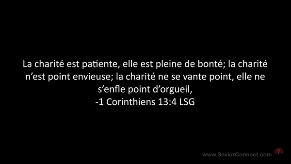 La charité est patiente, elle est pleine de bonté; la charité n'est point envieuse; la charité ne se vante point, elle ne s'enfle point d'orgueil, -1 Corinthiens 13:4 LSG