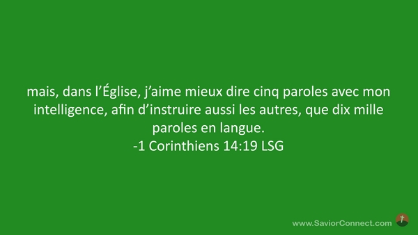 mais, dans l'Église, j'aime mieux dire cinq paroles avec mon intelligence, afin d'instruire aussi les autres, que dix mille paroles en langue. -1 Corinthiens 14:19 LSG