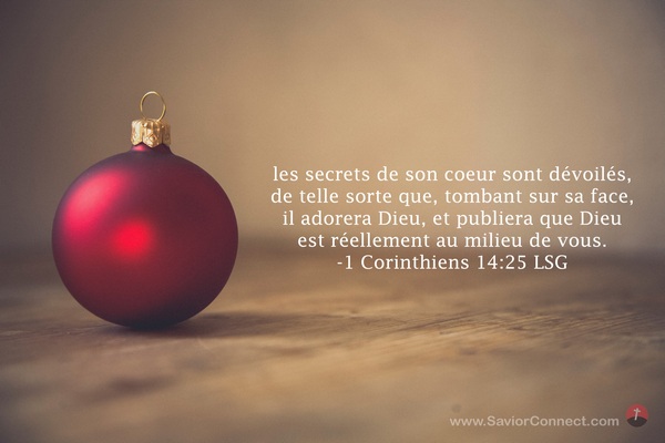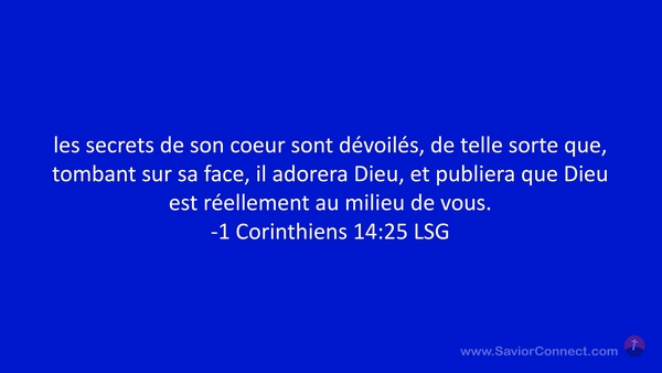 les secrets de son coeur sont dévoilés, de telle sorte que, tombant sur sa face, il adorera Dieu, et publiera que Dieu est réellement au milieu de vous. -1 Corinthiens 14:25 LSG