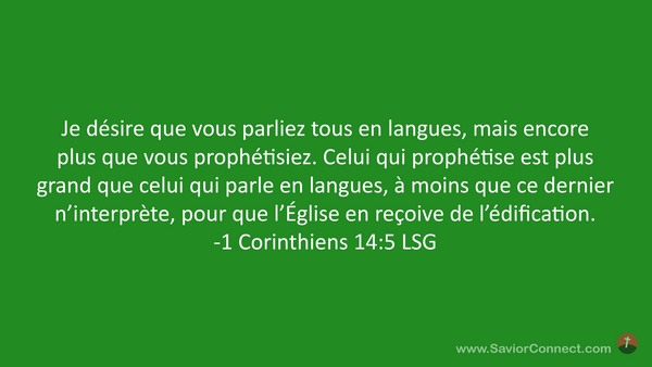 Je désire que vous parliez tous en langues, mais encore plus que vous prophétisiez. Celui qui prophétise est plus grand que celui qui parle en langues, à moins que ce dernier n'interprète, pour que l'Église en reçoive de l'édification. -1 Corinthiens 14:5 LSG