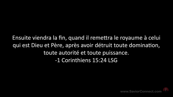 Ensuite viendra la fin, quand il remettra le royaume à celui qui est Dieu et Père, après avoir détruit toute domination, toute autorité et toute puissance. -1 Corinthiens 15:24 LSG