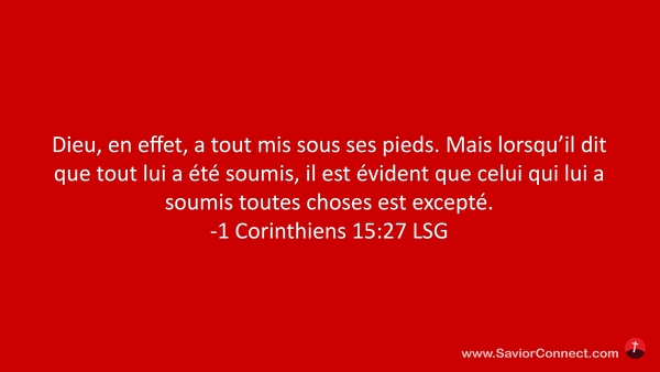 Dieu, en effet, a tout mis sous ses pieds. Mais lorsqu'il dit que tout lui a été soumis, il est évident que celui qui lui a soumis toutes choses est excepté. -1 Corinthiens 15:27 LSG