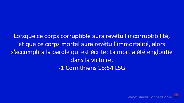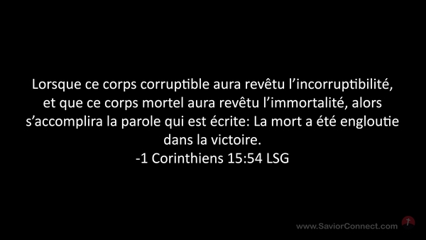 Lorsque ce corps corruptible aura revêtu l'incorruptibilité, et que ce corps mortel aura revêtu l'immortalité, alors s'accomplira la parole qui est écrite: La mort a été engloutie dans la victoire. -1 Corinthiens 15:54 LSG