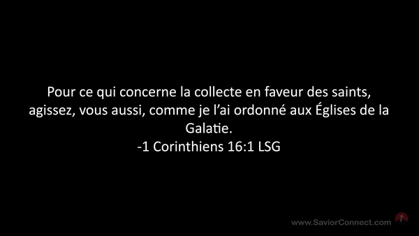 Pour ce qui concerne la collecte en faveur des saints, agissez, vous aussi, comme je l'ai ordonné aux Églises de la Galatie. -1 Corinthiens 16:1 LSG