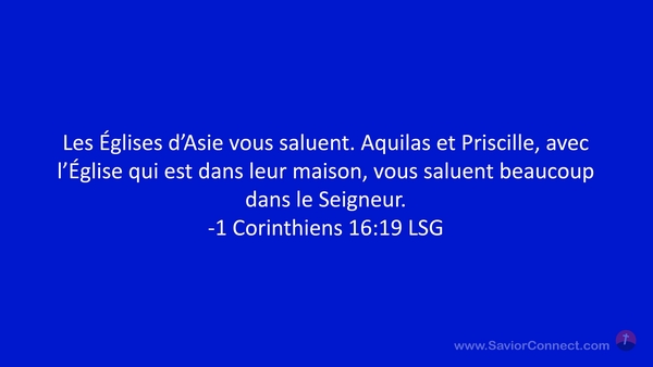 Les Églises d'Asie vous saluent. Aquilas et Priscille, avec l'Église qui est dans leur maison, vous saluent beaucoup dans le Seigneur. -1 Corinthiens 16:19 LSG