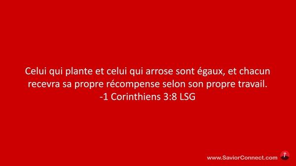 Celui qui plante et celui qui arrose sont égaux, et chacun recevra sa propre récompense selon son propre travail. -1 Corinthiens 3:8 LSG