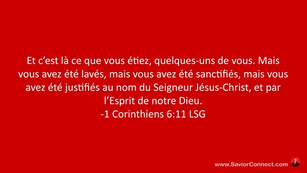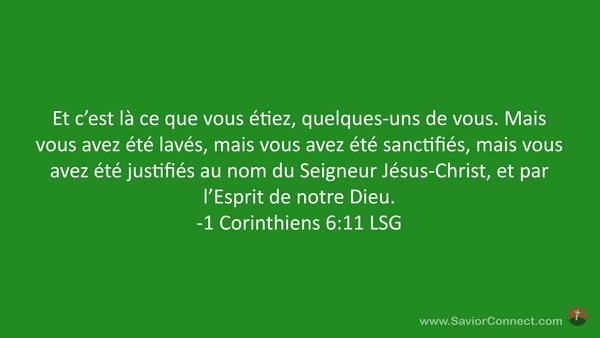 Et c'est là ce que vous étiez, quelques-uns de vous. Mais vous avez été lavés, mais vous avez été sanctifiés, mais vous avez été justifiés au nom du Seigneur Jésus-Christ, et par l'Esprit de notre Dieu. -1 Corinthiens 6:11 LSG