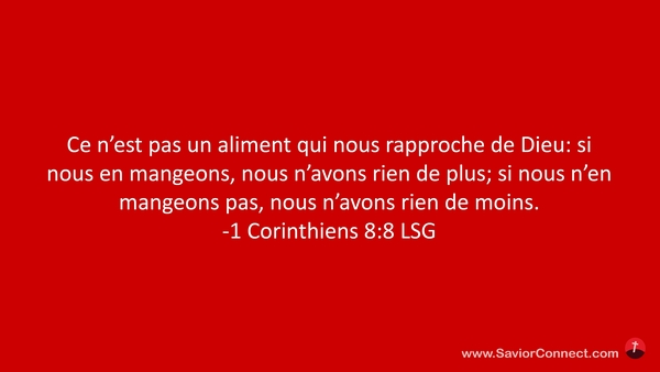 Ce n'est pas un aliment qui nous rapproche de Dieu: si nous en mangeons, nous n'avons rien de plus; si nous n'en mangeons pas, nous n'avons rien de moins. -1 Corinthiens 8:8 LSG