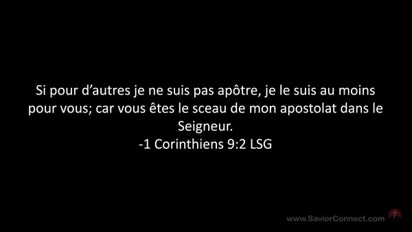 Si pour d'autres je ne suis pas apôtre, je le suis au moins pour vous; car vous êtes le sceau de mon apostolat dans le Seigneur. -1 Corinthiens 9:2 LSG
